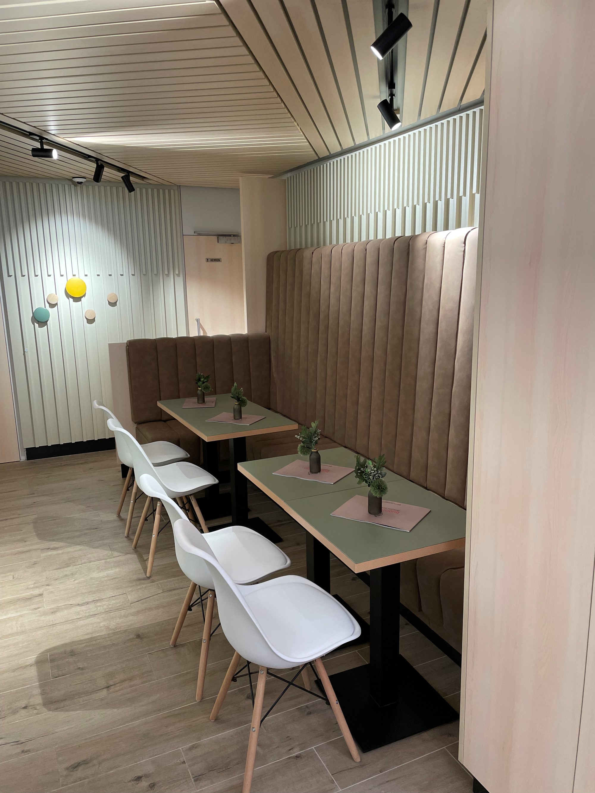 Die Farbpalette des Raums, die von der Unternehmenskette festgelegt wurde, besteht aus sehr natürlichen Tönen: Beige, Grün, Weiß und Pastellfarben. Diese Auswahl vermittelt die Naturbelassenheit und Frische der Zutaten sowie die hohe Qualität des angebotenen Produkts und zeichnet alle Filialen der Marke „Buonissimo“ aus.