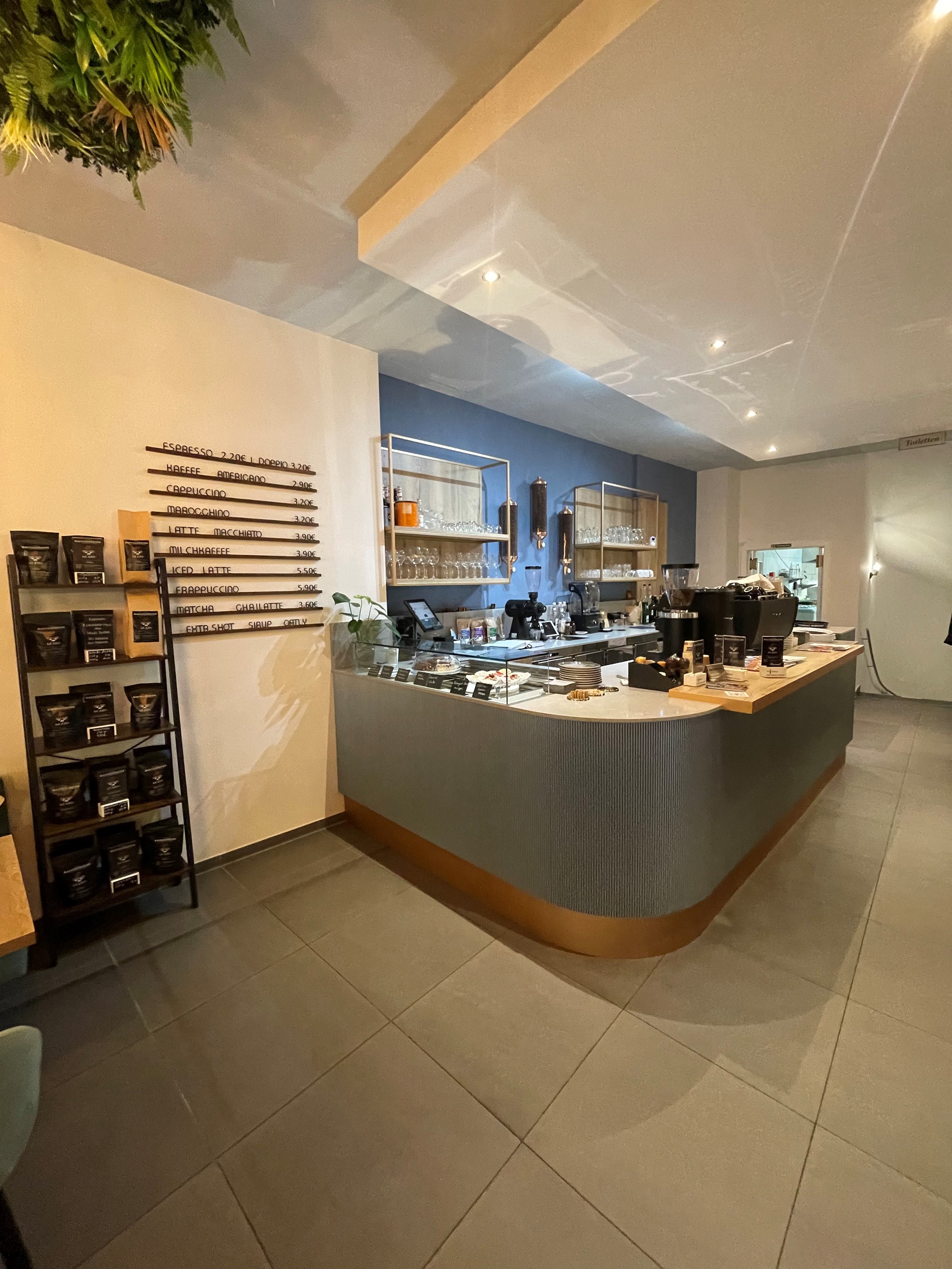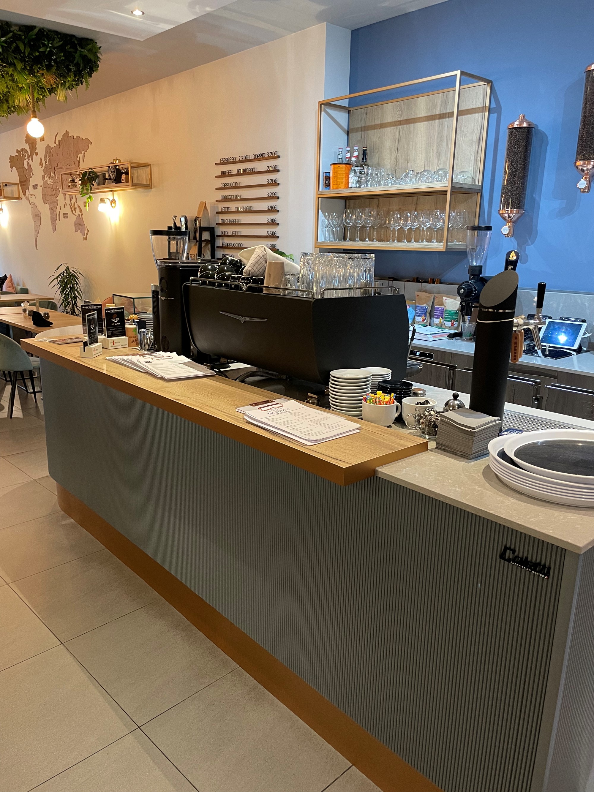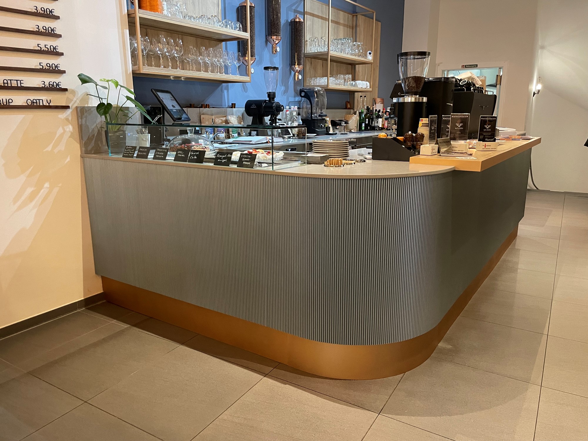 Im Zentrum des Raums sticht die ovale Theke hervor, das wahre Highlight des Designs: elegant, beeindruckend und so konzipiert, dass sie die Gäste in zeitgemäßem Stil empfängt. Ihre harmonische Form und die sorgfältigen Oberflächen vervollständigen die Atmosphäre des Lokals und schaffen ein raffiniertes, modernes Umfeld, perfekt, um Kaffee in all seinen Facetten zu genießen.