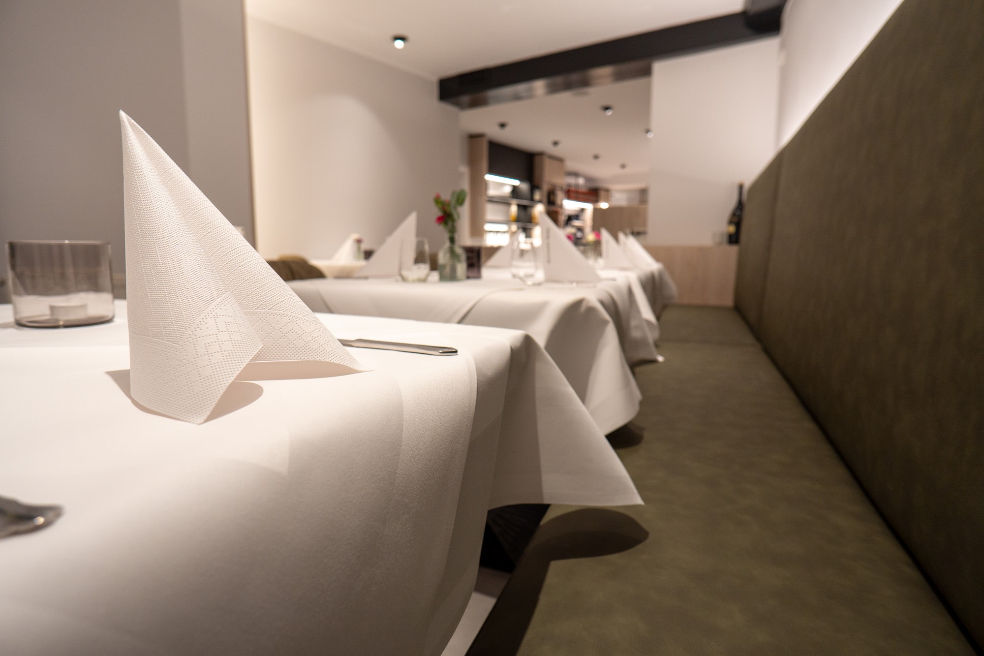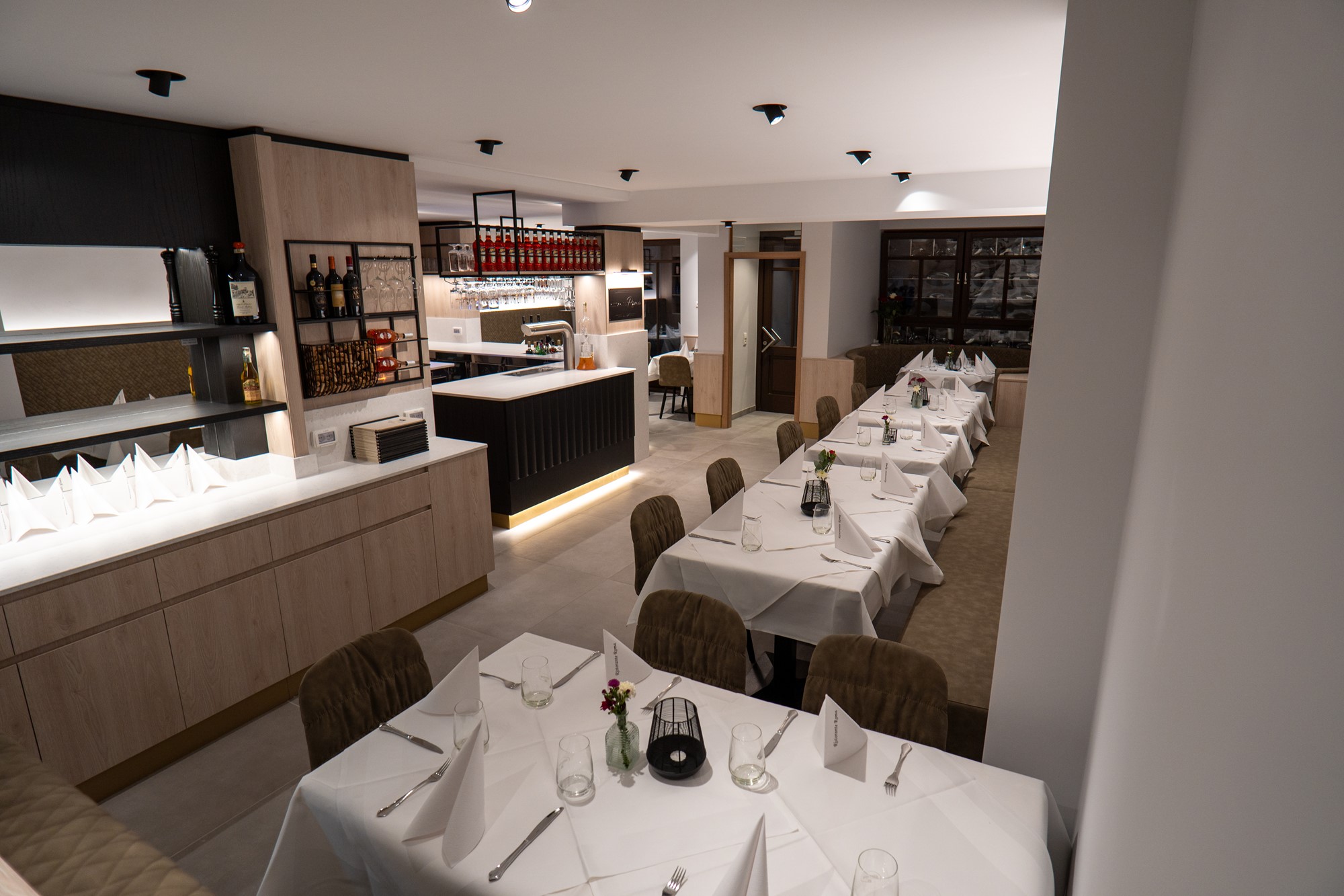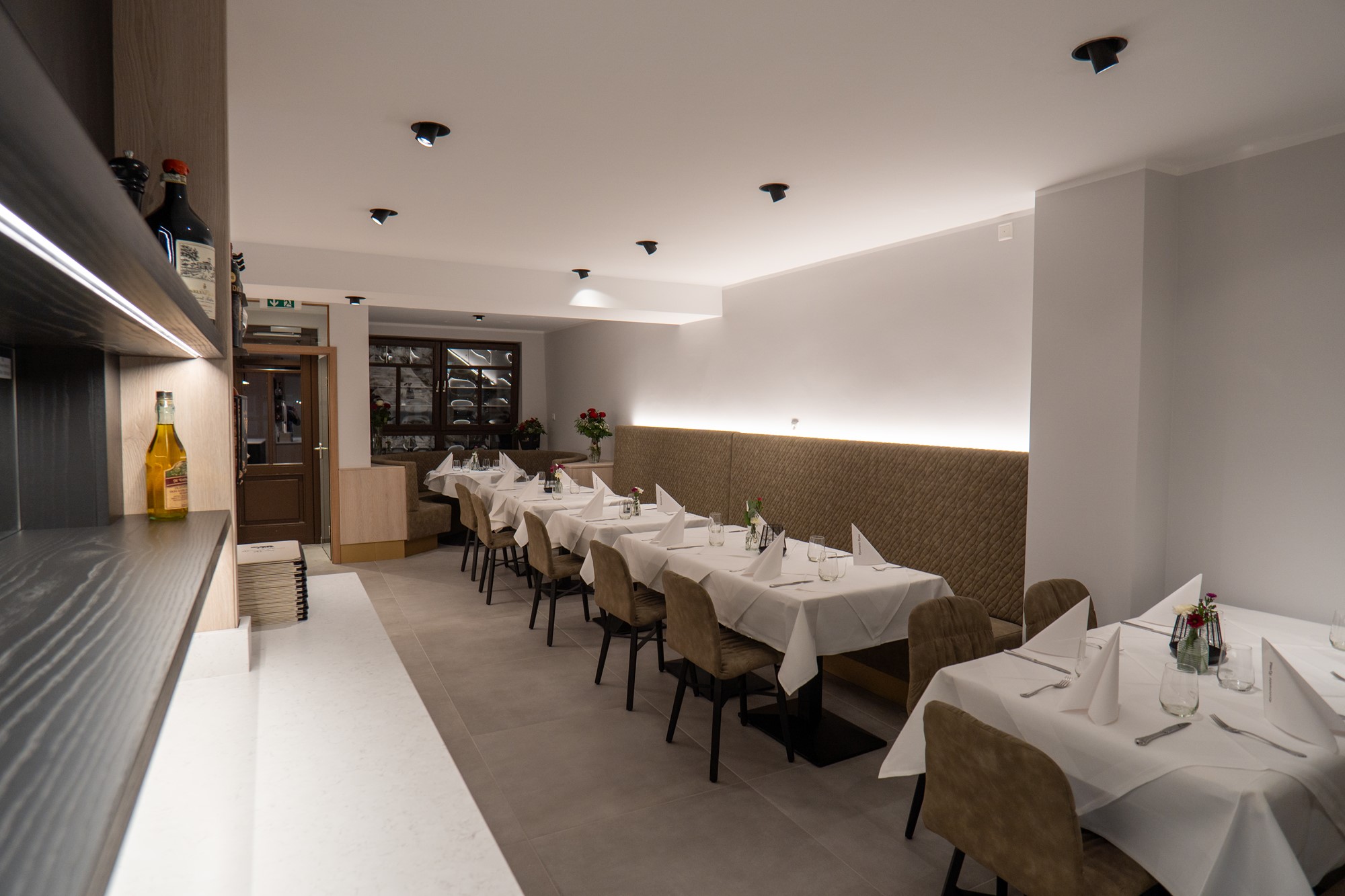 Das Einrichtungsprojekt für das Restaurant Roma basiert auf einem Gleichgewicht von Farbkontrasten, die sich in verschiedenen Elementen wiederholen: zwischen dem hellen Holz der Möbel und den mattschwarzen Oberflächen der Theke oder zwischen den Sitzmöbeln in Brauntönen und der weißen Tischwäsche. Die Theke selbst, die eine zentrale Rolle im Raum einnimmt, setzt dieses Spiel der Kontraste fort: Die schwarzen Seitenflächen werden nämlich von dem goldfarbenen, beleuchteten Sockel und der Thekenplatte in reinem Weiß ergänzt.