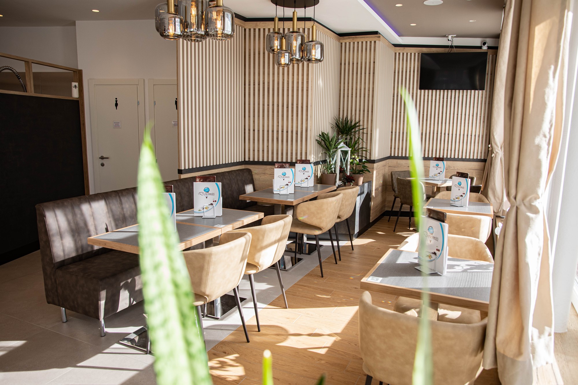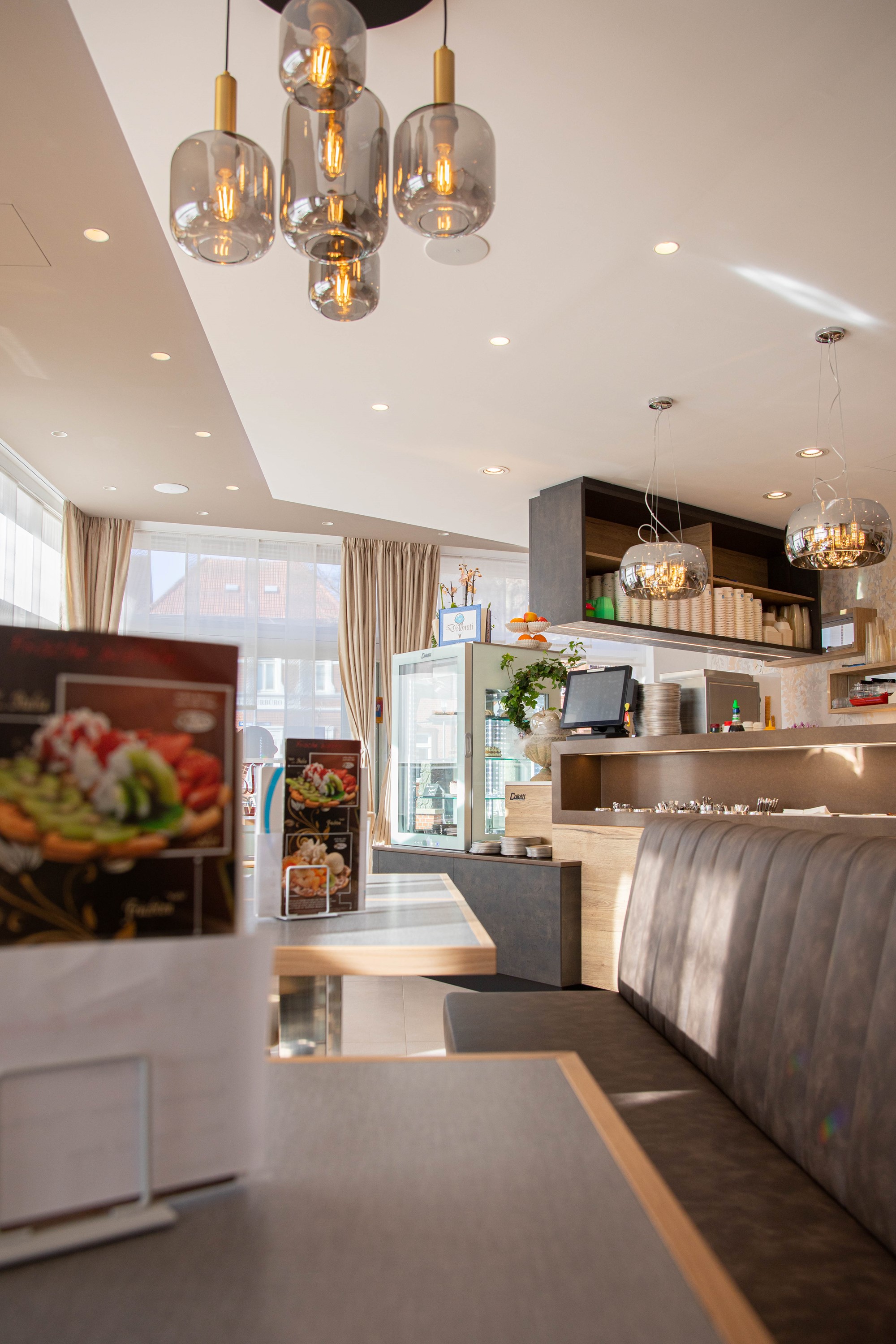 The Eiscafe Dolomiti project is a bespoke ice-cream parlour fit-out that enhances the space and creates a modern ambiance. Characterised by clean-cut silhouettes, making the space appear tidy and bright, this venue stands out for a colour palette composed of three shades: white, beige, and dark brown.