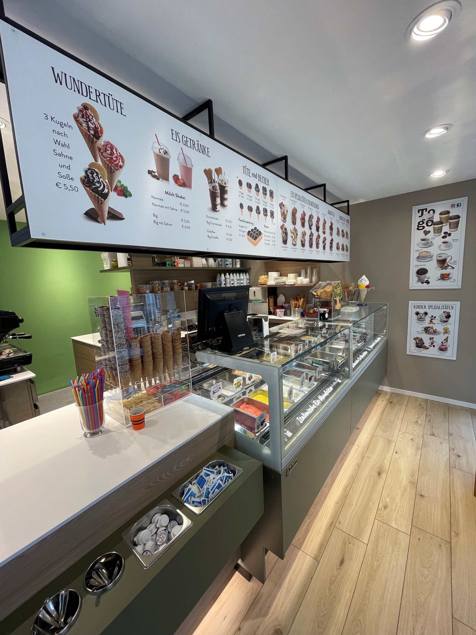 The ice cream counter, the visual centerpiece of the shop, is coated in a fresh and captivating color and designed to showcase artisan gelato at its best. The selected shade conveys freshness, quality, and authenticity, reinforcing the identity of the product and naturally inviting customers to taste it.