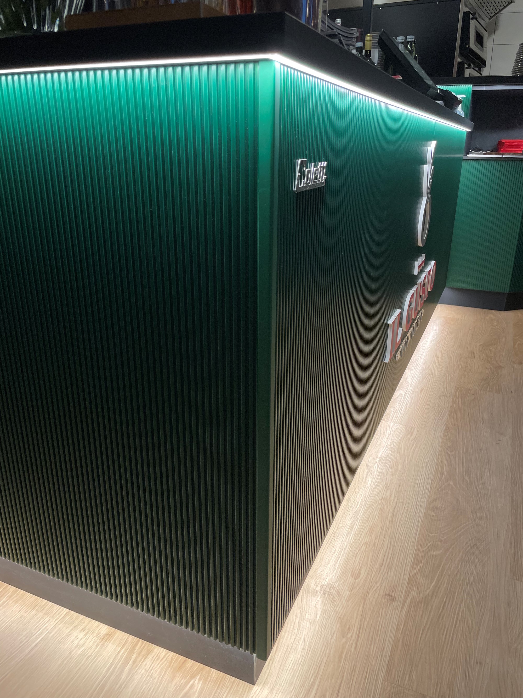 The true focal point of the dining room is the bar counter, framed by a refined petrol-green fluted paneling— a contemporary choice with a subtle retro appeal. The LED-lit edge, combined with the textured cannettato surface, creates a captivating interplay of light and shadow, while the dark stone-effect countertop adds depth and a sophisticated material contrast.
