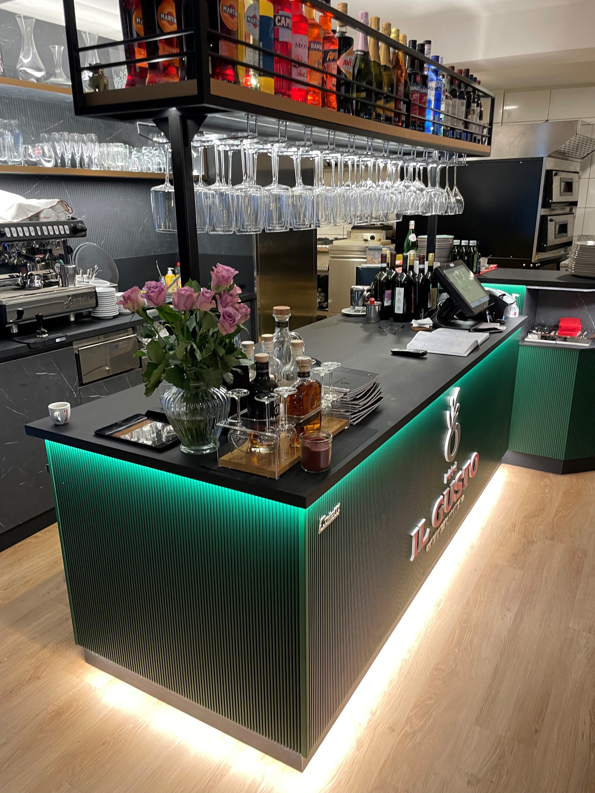 The same design concept continues behind the bar, where materials meet in perfect balance: iron, stone-effect laminate, and dark finishes that evoke a modern, refined style in harmony with the restaurant’s identity.