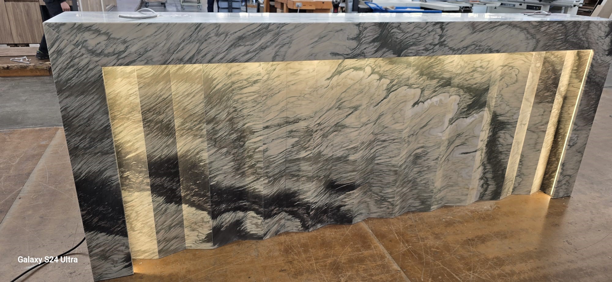 ● Sculptural and striking – Its dynamic, flowing, almost “liquid” veining turns every surface into a natural work of art.● Unique and unrepeatable – No two blocks of Cipollino marble are the same; each counter becomes an exclusive and non-replicable piece.● Ideal for luxury settings – The material, craftsmanship, and design make it perfect for elegant venues, high-end hotels, and premium lounges.● Dramatic backlighting – The counter features a backlighting system that enhances the stone’s movement, creating a scenographic and highly impactful visual effect.