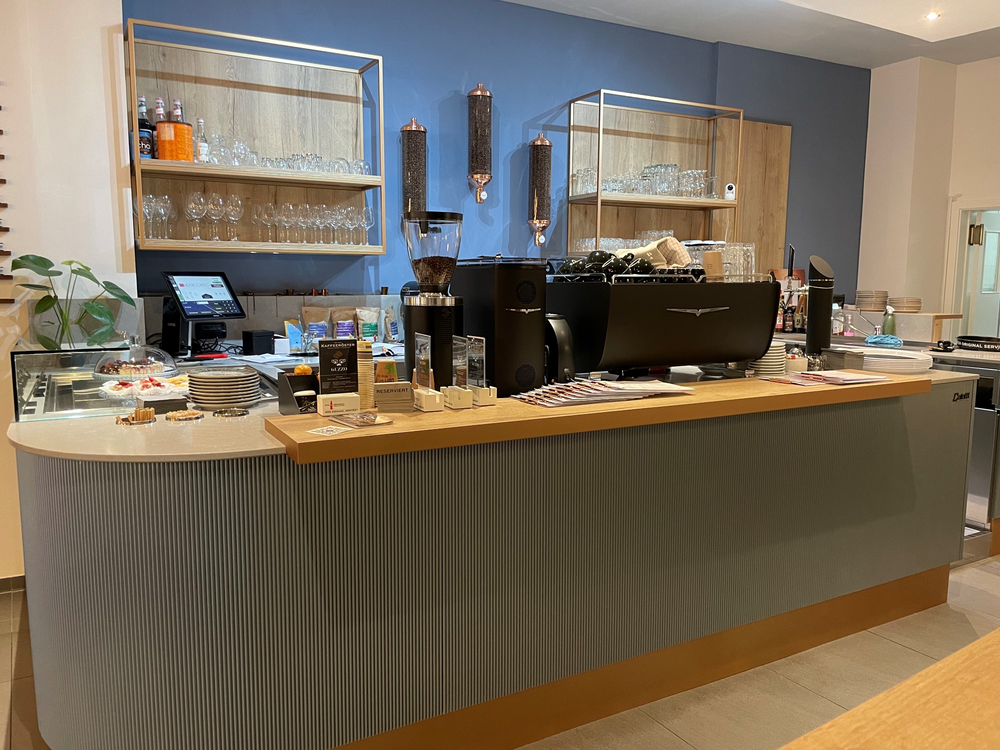 Al centro della sala spicca il bancone ovale, vero protagonista del design: elegante, scenografico e progettato per accogliere gli ospiti con uno stile contemporaneo. La sua forma armoniosa e le finiture curate completano l’atmosfera del locale, creando un ambiente raffinato, moderno e perfetto per vivere il caffè in tutte le sue sfumature.